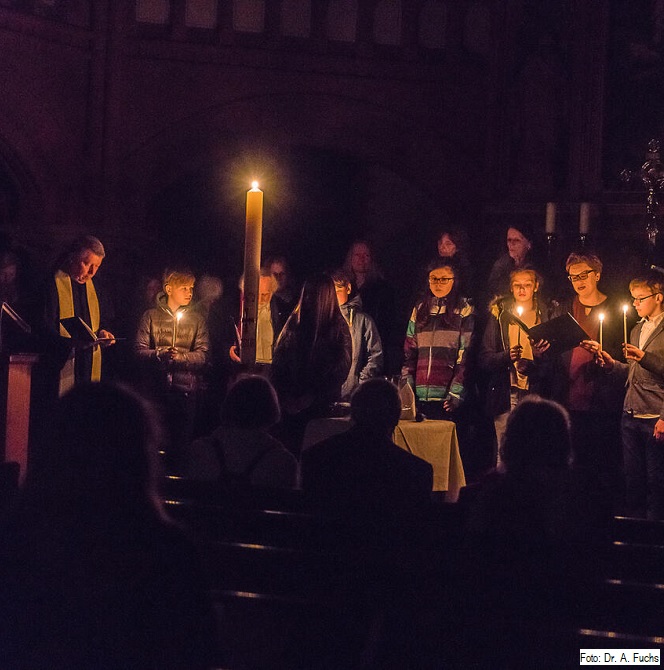 Um 6 Uhr laden wir zur Feier der Osternacht in die Dreifaltigkeitskirche ein. Mit alten liturgischen Gesängen und dem Gesang des Osterchores unter Leitung von Sylvia Bleimund wird das Licht der Osterkerze in die noch dunkle Kirche getragen und durch die Reihen gegeben.