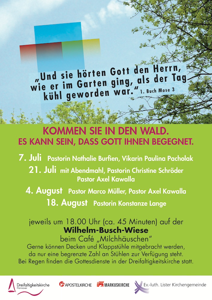 Während der Sommermonate laden wir nach guter Tradition zu mehreren Waldgottesdiensten auf die Wilhelm-Busch-Wiese in der Eilenriede ein - nach dem gelungenen Testlauf im letzten Jahr wieder gemeinsam mit unseren Nachbargemeinden aus dem "Gestaltungsraum" (Apostel-und-Markus-Kirche, Friedenskirche, Lister Kirchen). Die Gottesdienste beginnen jeweils um 18 Uhr und dauern ca. 45 Minuten. Zur besonderen Atmosphäre trägt neben der Freiluftumgebung auch die abwechslungsreiche Musik bei. Bringen Sie gerne eine Picknickdecke oder einen Klappstuhl als Sitzgelegenheit mit, da nur eine begrenzte Zahl an Stühlen zur Verfügung steht. Bei Regen finden die Gottesdienste in unserer Dreifaltigkeitskirche statt.