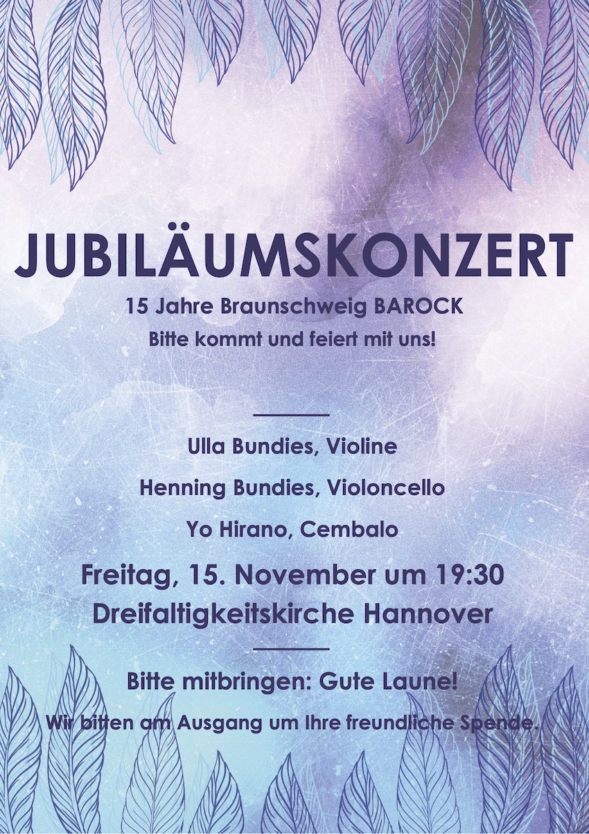 Wir feiern in diesem Jahr das 15-jährige Bestehen des Ensembles für alte und zeitgenössische Musik "Braunschweig BAROCK". Wer kann sich nicht an das letzte Konzert des Ensembles in der Dreifaltigkeitskirche erinnern? Das war im Jahr 2018 mit der "Orientalischen Rejse nach Isfahan". Damit trat das internationale Konzertpublikum eine musikalische Expedition über 400 Jahre, 5.000 km und zwei Kulturkreise an und kam heile wieder zurück.