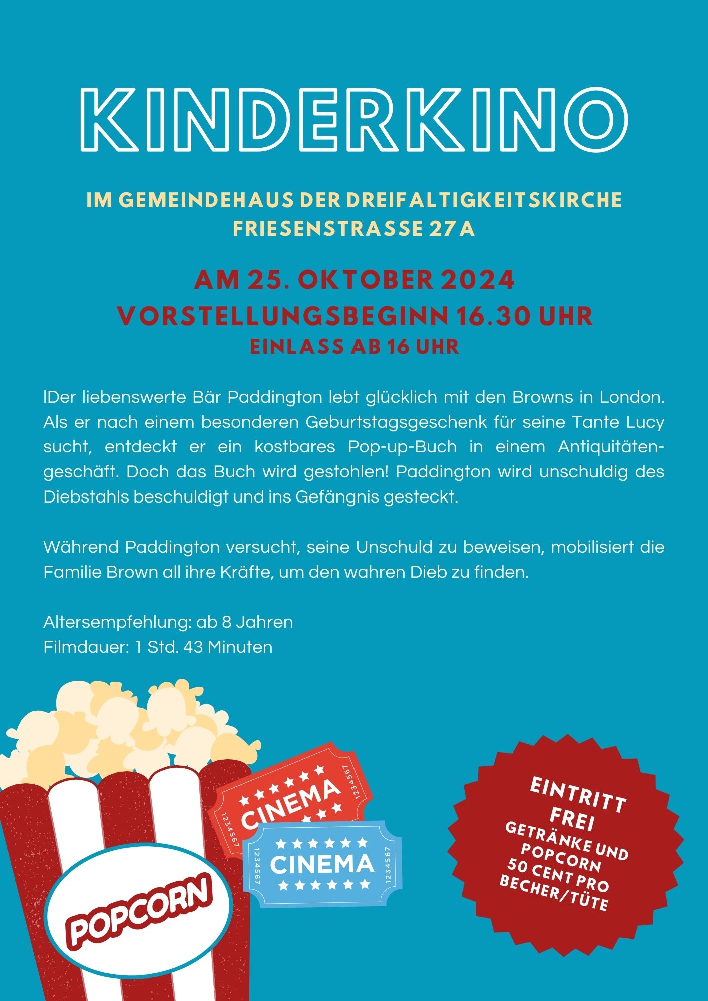 Am Freitag, den 25. Oktober 2024, sind alle Kinder ab Grundschulalter wieder herzlich eingeladen zum Kinderkino in den Gemeindesaal der Dreifaltigkeitskirche (Friesenstraße 27A). Einlass ab 16 Uhr, Vorstellungsbeginn um 16.30 Uhr.