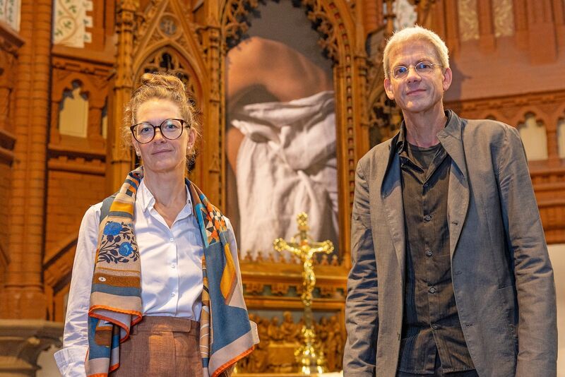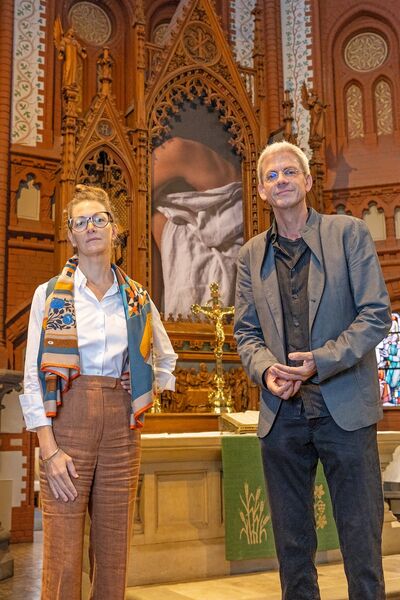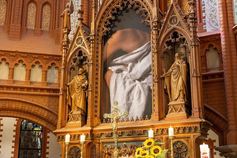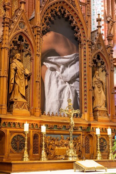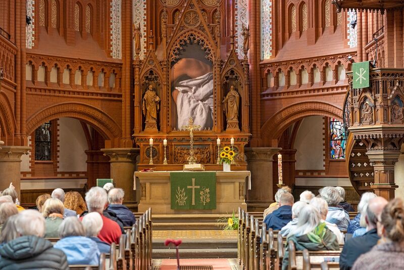Von welchem Bild sind Sie ganz hin und weg? - Wir leben alle mit Bildern: geliebten Bildern, die wir immer wieder ansehen wollen; und ungeliebten Bildern, die wir ansehen müssen. Als Christ*innen können wir die Bilder in unseren Kirchen befragen: Inwiefern prägen diese Bilder unseren Glauben? Welche Bilder sind heute angemessen? Die Antwort auf diese Fragen wird immer so vielfältig sein, wie die Menschen, die solche Bilder betrachten. Wir machen in den nächsten Monaten Erfahrungen mit einem neuen, einem Altar-Bild auf Zeit. Das Bild von 1883 ist ausgebaut und verwahrt und an seiner Stelle ein Werk einer Gegenwartskünstlerin eingebaut.